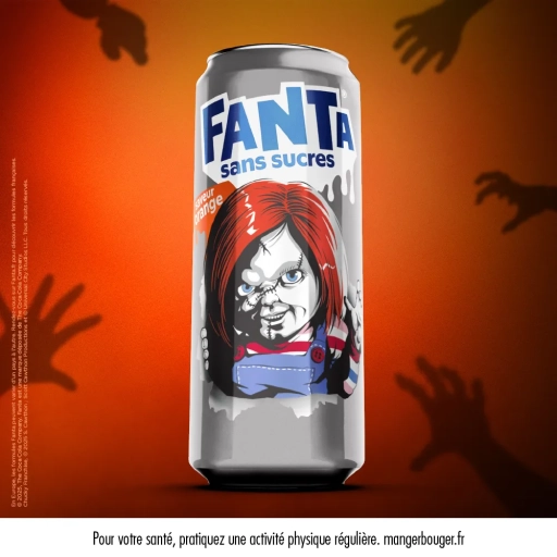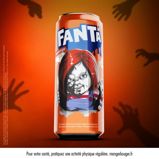 Une version classique du Fanta Orange — goût fruité, acidulé et rafraîchissant — habillée d'un design terrifiant à l'effigie de Chucky, la poupée maléfique de la franchise Child's Play.